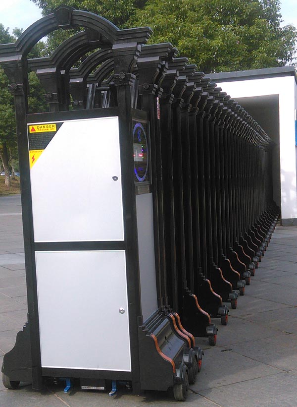 江阴伸缩门,就是门体可以伸缩自由移动,来控制门洞大小、来控制行人或车辆的拦截和放行的一种门。江阴伸缩门主要由门体、驱动电机,滑道、控制系统构成。门体采用优质不锈钢及铝合金专用型材制作,采用平行四边形原理铰接,伸缩灵活行程大。驱动器采用特种电机驱动,蜗杆蜗轮减速,并设有自动离合或手动离合器,自动离合停电时可自动启闭,手动离合停电时可手动启闭,控制系统有控制板,按钮开关,另可根据需求配备无线遥控装置。