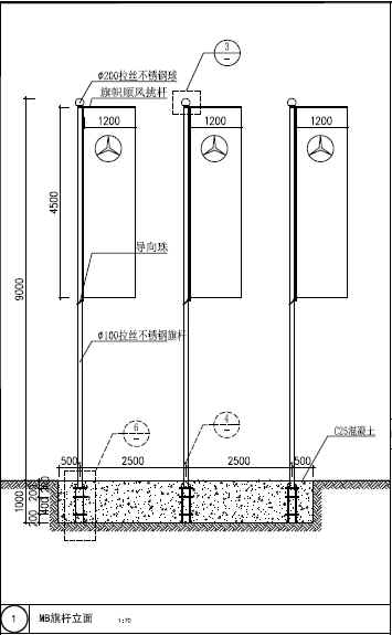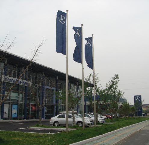 无锡德星奔驰4S店选用本公司9米旗杆3支作为刀旗杆,由于公司产品质量可靠,被奔驰4S店选为旗杆定点生产厂家,先后为宜兴奔驰4S店旗杆、南京奔驰4S店旗杆、杭州奔驰4S店旗杆、南昌奔驰4S店旗杆、南通奔驰4S店旗杆、启东奔驰4S店旗杆等众多奔驰4S店选为定点生产厂家。由于奔驰4S店新标准产生,本公司设计了全新一代符合新产品要求的奔驰4S店旗杆,该旗杆的挂旗杆长度由原来的3.6米改为4.5米,横杆长度为1.2米